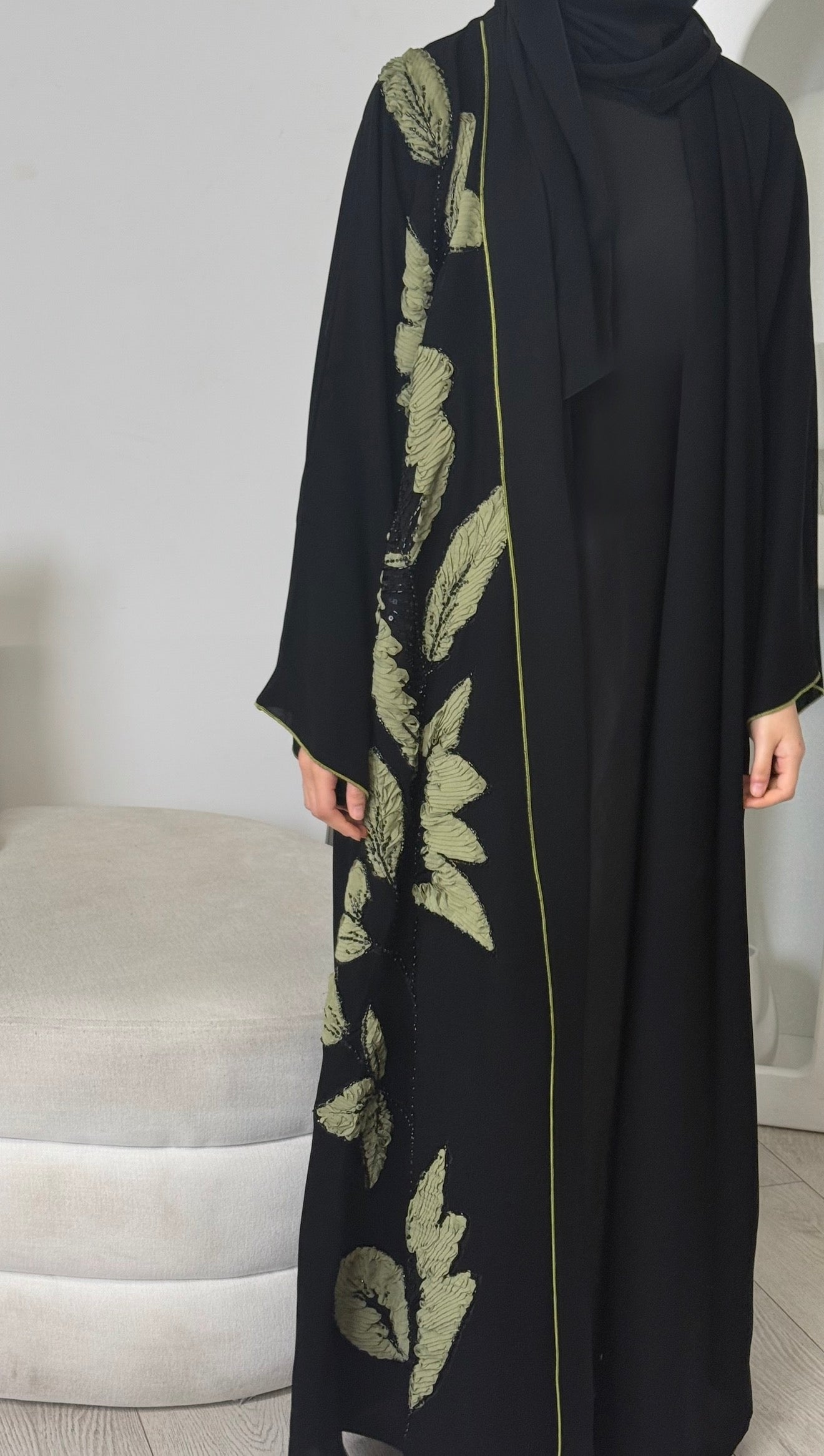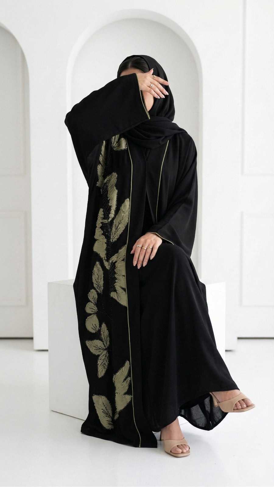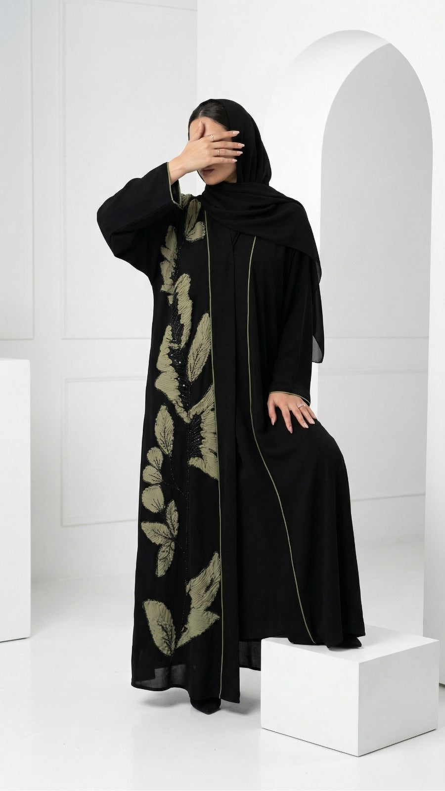 The Midnight Olive Abaya blends timeless black elegance with soft olive floral detailing, creating a refined look that feels both classic and distinctive. The delicate embroidery flows gracefully along the silhouette, adding subtle texture and visual interest while maintaining a clean, sophisticated finish.